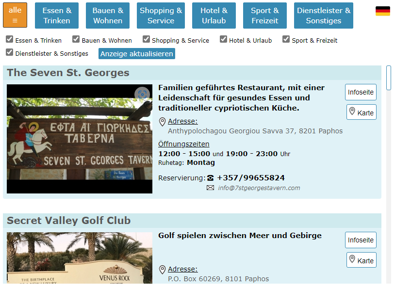 Die Listenansicht kann über Buttons nach einzelen Branchenbereichen und innerhalb eines Branchenbereiches über Merkmale (Checkboxen) gefiltert werden. Zu jedem Branchenbucheintrag kann eine Infoseite mit ausführlicher Beschreibung, Merkmalen, Räumlichkeit, Lage, verfügbare Sprachen, Bildergalerie, Veranstaltungen, Karte und weiterführende Infolinks angezeigt werden.