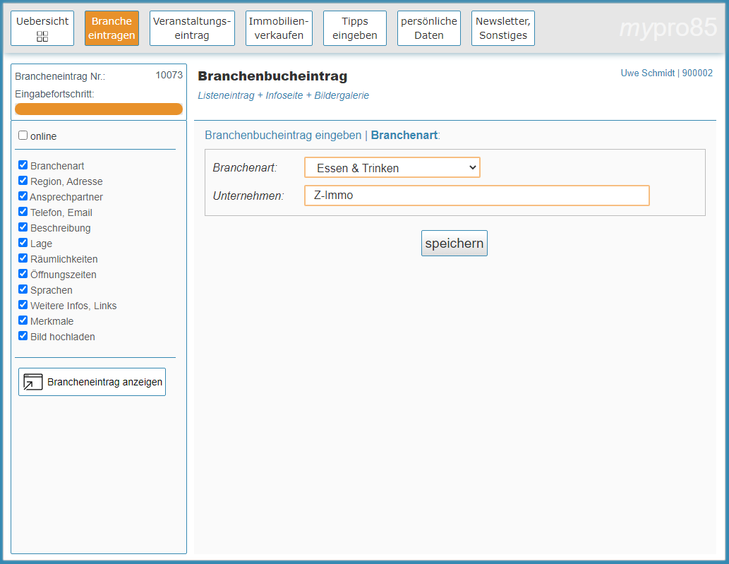 Auf einer passwortgeschützten Seite können registrierte Geschäftspartner die Daten für den Branchenbucheintrag und der Infoseite eingeben, Merkmale zuordnen und Bilder hochladen.
