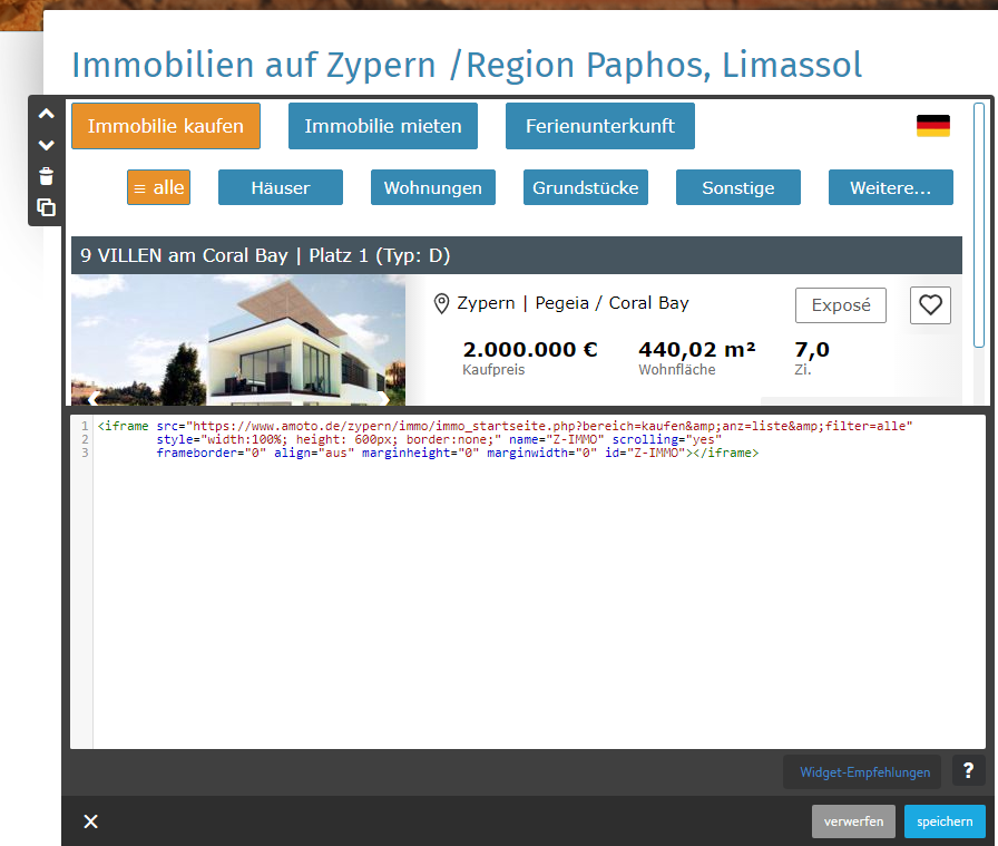 Im Seiteneditor kann über das WIDGET-TOOL ein entsprechender HTML-CODE für die Seiteneinbindung eingegeben werden.
